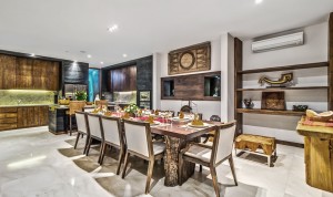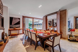 To make your in house dining experience a memorable one, the dining room is furnished in white marble with a large teak table that allows seating for up to ten guests at any one sitting.