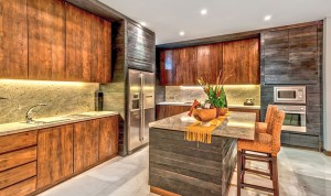 The modern kitchen is finished in burnt wood with state of the art equipment.