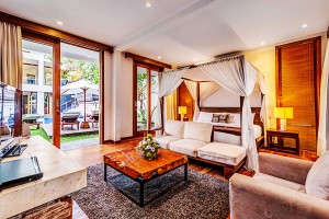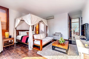 The Jiwa Suite boasts a super four poster kingsize bed with draping curtains. The floor is finished in wood and features a view of the courtyard pool area. Wall curtains allow maximum comfort whilst in your room.